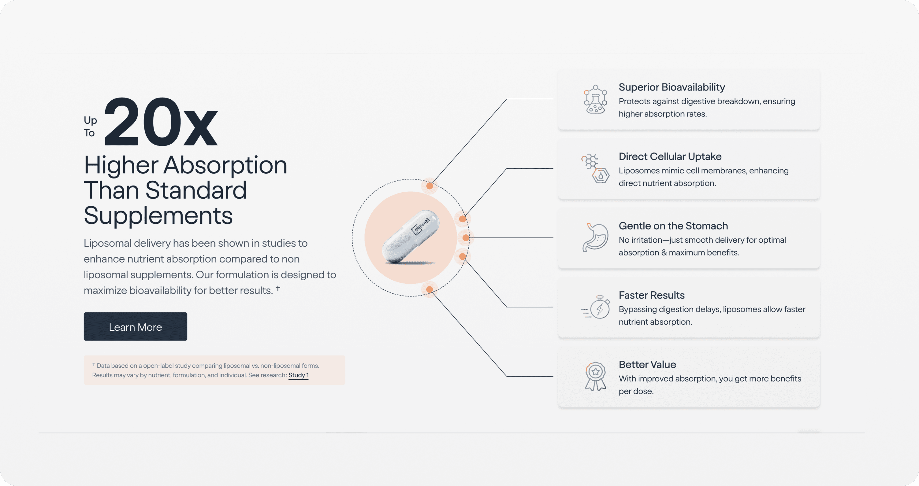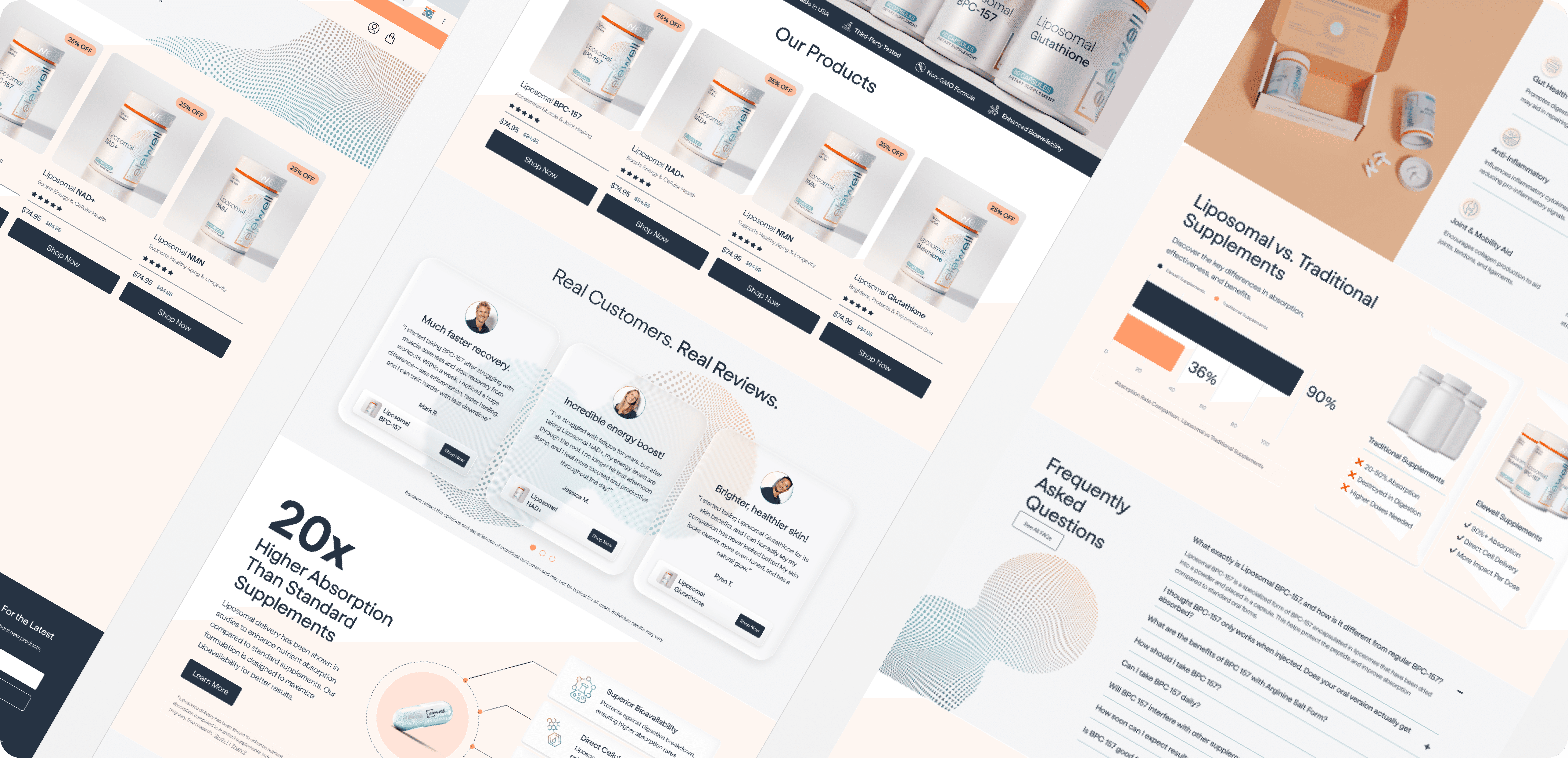 Elewell is a high-tech wellness brand specializing in liposomal delivery—a process that encapsulates nutrients in lipid vesicles for 20x better absorption. The challenge was to create a digital storefront that didn't just sell a bottle, but sold the science of superior absorption. By pivoting the design from a generic supplement shop to an education-first commerce platform, I helped bridge the gap between premium price points and consumer trust.