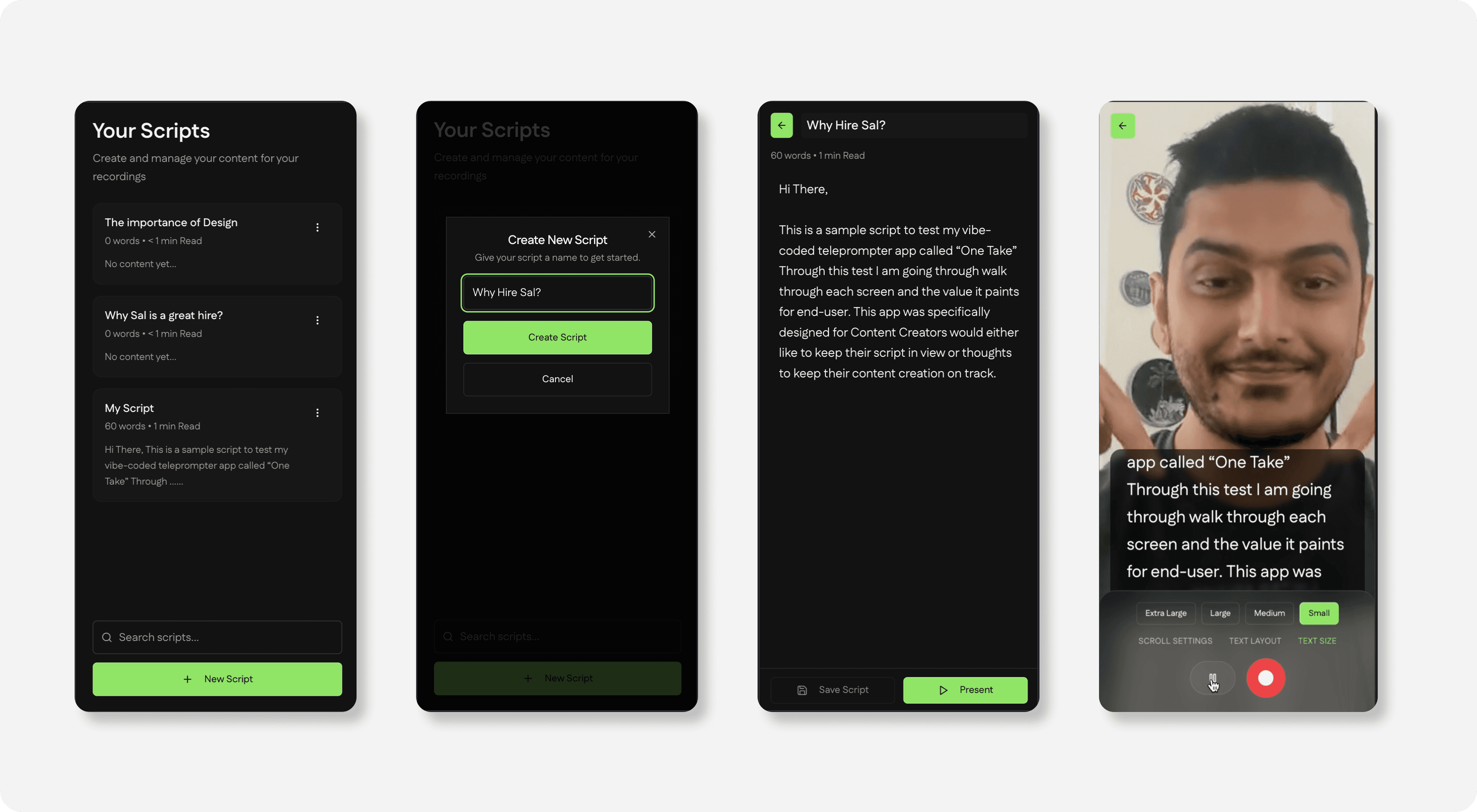 One Take is a mobile teleprompter application specifically engineered for the modern content creator. Recognizing that the barrier to high-quality video content is often the friction of script memorization and eye-contact management, I designed a "vibe-coded" interface that prioritizes flow over complexity. By blending a high-contrast dark aesthetic with intuitive, thumb-friendly controls, One Take transforms a smartphone into a professional-grade studio tool.